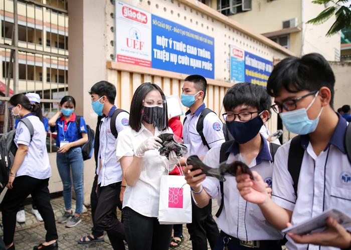 Với mong muốn đóng góp một chút món quà tinh thần cho mọi người, các cô gái SGO48 đã đến một số điểm thi vào buổi sáng và buổi chiều để trao tặng những chiếc khẩu trang vải kháng khuẩn được đặt may kỹ lưỡng như một lời động viên gửi đến các sĩ tử, vừa góp phần bảo vệ môi trường.