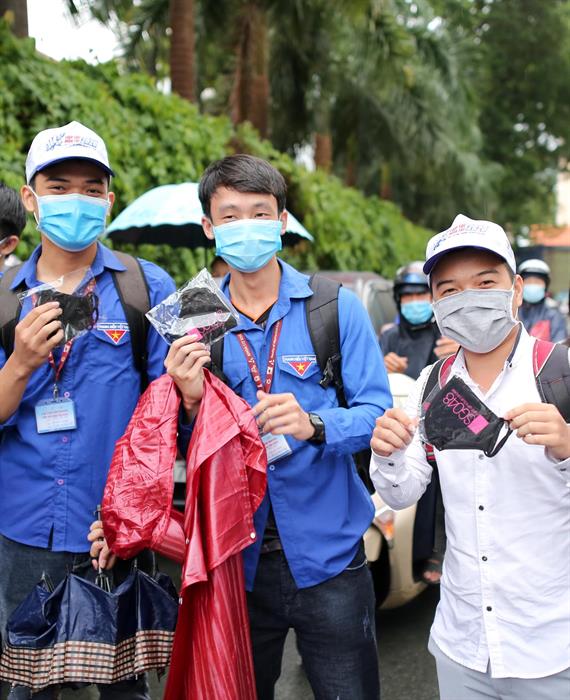 2 thành viên Kaycee và Mochi không ngại mưa, tiếp tục có mặt tại các điểm trường để tặng khẩu trang cho thí sinh.