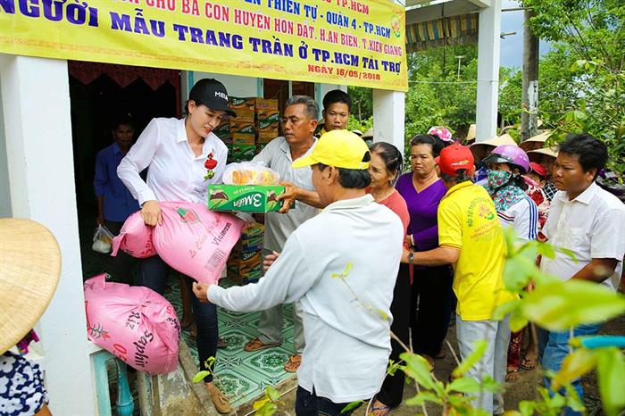 Vẫn hình ảnh giản dị, thân thiện như những lần đi từ thiện trước đây, lần này Trang Trần còn tự tay vác đồ để phân phát cho người dân nghèo và thăm hỏi, tặng quà cho các em nhỏ tại Kiên Giang.