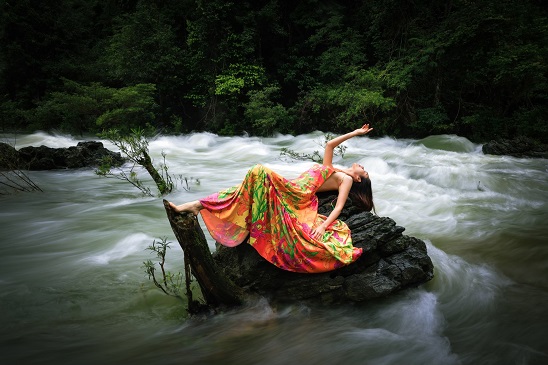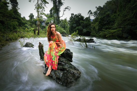 Tiếp theo, Á hậu Hoàng My cùng đoàn du lịch di chuyển đến “ngọn nguồn” của dòng lũ – Suối nước Moọc. Đoạn đường rừng này ẩm ướt, sình lầy và khá nguy hiểm. Tuy nhiên, vừa đặt chân đến đây, cảnh quan hùng vĩ và diễm lệ của thiên nhiên khiến Á hậu không khỏi ngạc nhiên. Sự cuồn cuộn và mạnh mẽ của nước suối nguồn tạo nên nguồn cảm hứng cho Hoàng My. Vẫn là một thiết kế của NTk Adrian Anh Tuấn nhưng bộ trang phục lần này lại phản ánh tinh thần của suối nước Moọc. Phần cổ yếm nữ tính giúp khoe ra phần lưng trần nữ tính, vừa thể hiện nét quyến rũ, vừa bí ẩn như nét đẹp của thiên nhiên nơi đây. Mái tóc dài thướt tha của Hoàng My cùng thần thái tạo dáng giúp bộ ảnh thêm phần đặc sắc.