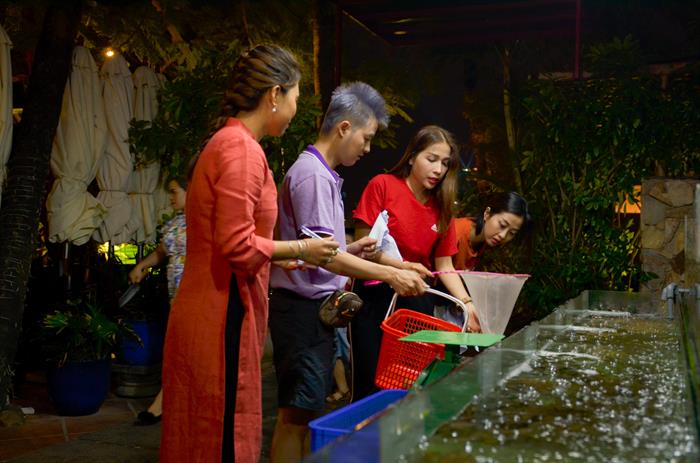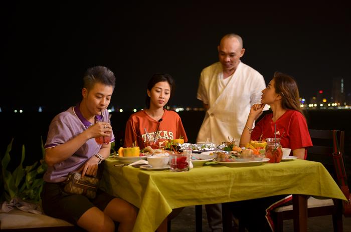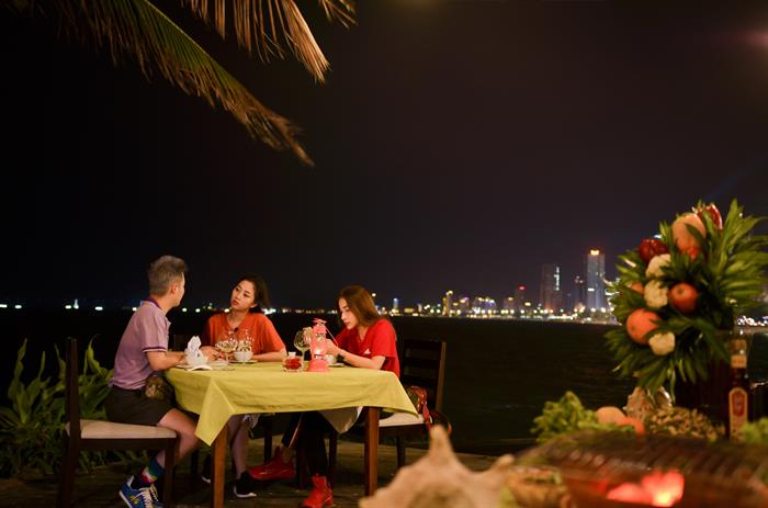 Vốn là một thành phố du lịch nên đời sống Nha Trang về đêm luôn thu hút du khách với rất nhiều những hoạt động thú vị của giới trẻ. Trước khi dành thời gian đi chơi đêm, Thanh Duy, Khả Như, Hà Trinh cũng kịp tranh thủ thưởng thức bữa tối lãng mạn tại một nhà hàng giáp biển, vừa được ăn các loại đặc sản, lại được ngắm nhìn Nha Trang về đêm trong không gian lộng gió mang hương vị mặn mà của biển.