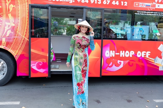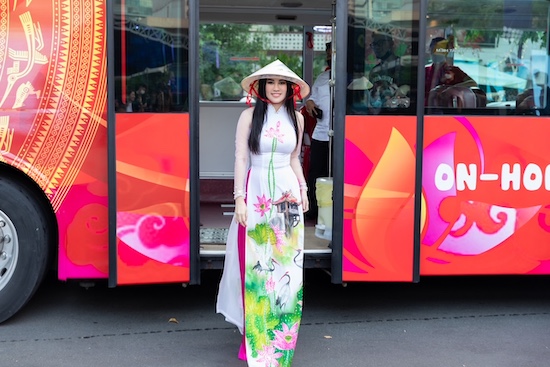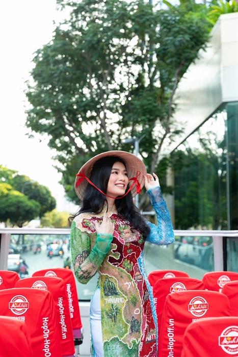 Để chuẩn bị cho người bạn quốc tế có những khoảnh khắc ấn tượng khi đến thăm Việt Nam, Hoa hậu Emily Hồng Nhung đã phải lên ý tưởng và chuẩn bị trang phục xinh xắn đó là tà áo dài Việt Nam truyền thống trông thật duyên dáng nền nã với những chiếc nón sen.