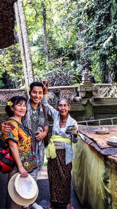 Ngoài hang thì xung quanh còn có thác nước và các hang động tuyệt đẹp, Nguyên Khang cẩn thận dìu mẹ xuống khu vực thác nước. Ở Goa Gajah, có những đền thiên thờ cúng các vị thần, Nguyên Khang và mẹ được một cụ bà canh đền ban nước thánh và cầu phúc.