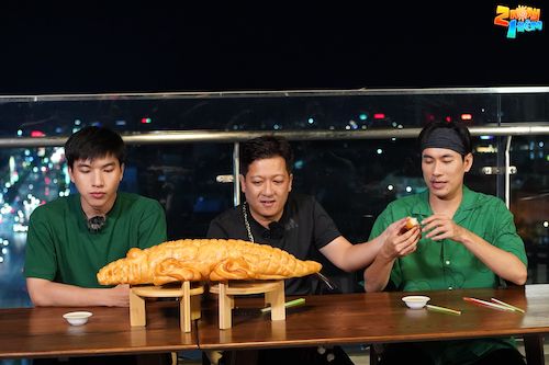 Trong tập 25 tiếp nối hành trình “cùng nhau làm nên Tết”, đội thua đã có một trận đấu bằng mũi để dành được cơ hội ăn tối, cả ba Trường Giang – Kiều Minh Tuấn – HIEUTHUHAI đều xuất sắc hoàn thành trận đấu và giành được phần ăn tối chỉ có Cris Phan bị “bỏ lại” nhưng vẫn được Ngô Kiến Huy “rũ lòng thương” lén lút đưa đồ ăn cho anh. Khi được PD thông báo bộ ba sẽ được thưởng thức món “cá sấu”, cả ba đều hoang mang ngỡ ngàng trước thông tin vừa nhận được nhưng khi món ăn được đem ra dàn cast lập tức vỡ òa trước chú cá sấu được làm từ bánh mì ăn cùng với sữa đặc. Bộ ba vô cùng hào hứng và phấn khích trước món ăn, “em Út” HIEUTHUHAI nhanh chóng được “anh Già” ưu ái phục vụ miếng đầu tiên Cris Phan ngồi bên cạnh vẫn dõi mắt theo từng chuyển động tay của Trường Giang với ánh mắt thèm thuồng khao khát nhưng đổi lại chỉ được ăn… không khí. Như trở lại tuổi thơ với bánh mì chấm sữa, dàn cast vô cùng hài lòng thưởng thức, từng kỉ niệm thơ ấu như đang tràn về trong lòng mỗi người nhưng Dương Lâm vẫn quyết không ngừng xéo sắc hơn thua, cà khịa đội bên ăn không ngon nên phải…nói bù.