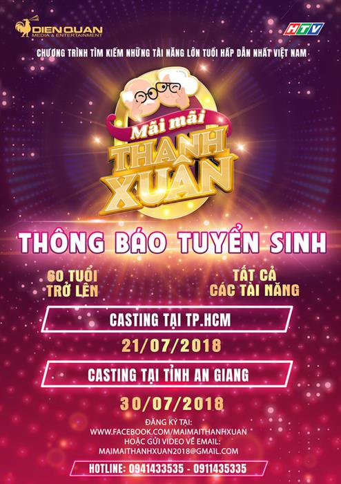 Mãi Mãi Thanh Xuân chính thức khởi động tuyển sinh trên khắp cả nước nhằm “chiêu mộ” tài năng của các thí sinh “già tuổi” ở mọi lĩnh vực. Đợt casting đầu tiên sẽ được diễn ra vào ngày 22/07/2018 tại TP HCM, tiếp đó Mãi Mãi Thanh Xuân sẽ tiếp tục đổ bộ xuống khu vực miền Tây vào ngày 30/07/2018 tại An Giang để chắc chắn sẽ không bỏ lỡ bất cứ tài năng nào của đất nước hình chữ S.