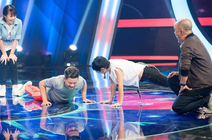 Tiết Cương và Thùy Trang là cặp đôi của chiến lược gia Quốc Thuận, xuất hiện với trang phục thể thao tôn xuyệt tôn màu xanh đọt chuối. Hoàng Mèo cũng không kém cạnh đối thủ khi diện chiếc quần thể thao màu đỏ rực. Hai đội chơi không ngần ngại thách đấu nhau những thử thách thú vị ngay khi mới bước ra sân khấu chào khán giả, không đợi đến những phần thi chính thức. Trưởng nhóm hài “Những người bạn” – Tiết Cương đã yêu cầu Hoàng Mèo hít đất 20 cái. Nam diễn viên ngậm ngùi làm theo, tuy nhiên, vì thân hình quá khổ, Hoàng Mèo không thể nhấc được cả cơ thể lên và làm đúng động tác hít đất. Anh chỉ chống đẩy mỗi phần tay, còn từ bụng trở xuống đã nằm bệt xuống mặt đất không thể nhấc lên nổi. Chứng kiến cảnh này khán giả tại trường quay được phen ôm bụng cười. Trả đũa đối thủ, diễn viên Hoàng Mèo nhờ vũ công của chương trình làm mẫu vài động tác múa và thách đố Tiết Cương làm lại. Học trò Công Ninh không chút lo lắng: “Gì chứ múa, tôi mê từ nhỏ!”. Tuy nhiên, trái với sự tự tin trong lời nói, anh có màn nhảy sexy “khó đỡ” khiến ai nấy cũng không nhịn được cười và mừng thầm “May quá! Anh ấy là diễn viên chứ không chọn nghề diễn viên múa!”.