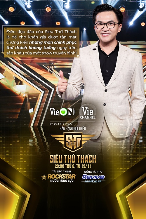 Tintuc - Chương trình Siêu Thử Thách chính thức lên sóng lúc 20h thứ Sáu hàng tuần trên ứng dụng VieON và kênh Vie Channel – HTV2, Vie GIẢITRÍ từ 19/11, với sự đổ bộ của hàng loạt những người sở hữu tài năng, năng lực dị biệt sẵn sàng chinh phục những thử thách không tưởng.