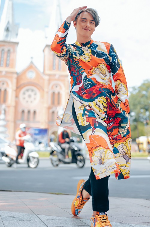 Nam diễn viên tiết lộ các trang phục áo dài đầy sắc màu này đến từ nhà thiết kế Thủy Nguyễn.Không chỉ thu hút ánh nhìn với những tông màu nền nã, loạt áo dài mà Hải Đăng diện còn toát lên sự trẻ trung, sành điệu với những họa tiết bắt mắt, được cách điệu từ những hình ảnh quen thuộc trong văn hóa dân gian.