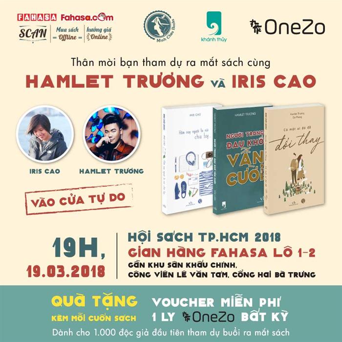 Hai cây bút trẻ nổi tiếng với hiện tượng tái bản liên tục chục nghìn bản Hamlet Trương và Iris Cao hứa hẹn tiếp tục tạo cơn “sốt” tại Hội sách TP.HCM. Sự ủng hộ và yêu mến nhiệt tình của bạn đọc dành cho các tác phẩm: Ai rồi cũng khác, Mỉm cười cho qua, Mình sinh ra đâu phải để buồn.... là động lực chính để các tác giả tiếp tục ra mắt tác phẩm mới.