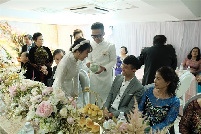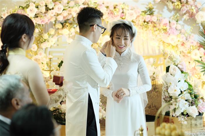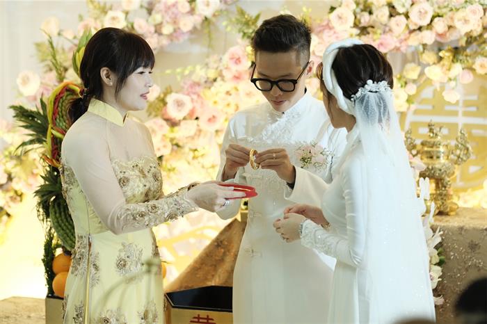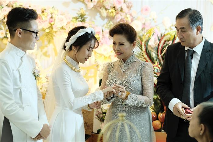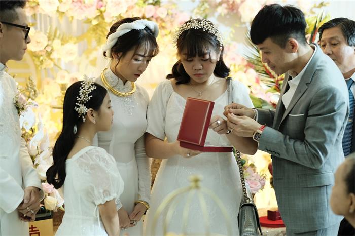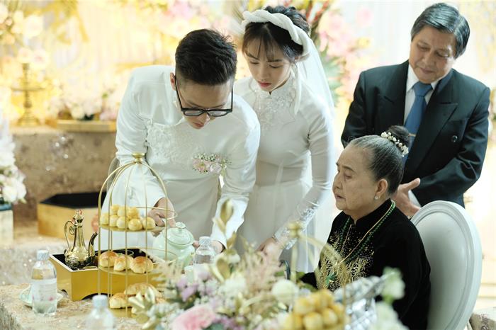 Minh Anh và chú rể Tâm Nguyễn nắm chặt tay, cười rạng rỡ khi thực hiện nghi thức của lễ cưới trước sự chứng kiến của người thân của cặp đôi và bạn bè. Ông bà nội của cô dâu rưng rưng khi ngắm nhìn cháu gái đầu lòng rạng rỡ lên xe hoa.