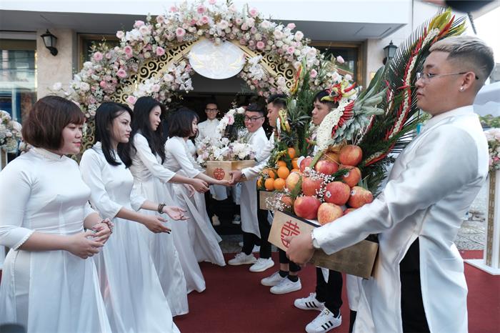 Lễ đón dâu diễn ra tại nhà riêng - một dinh thự rộng lớn tại quận 6 của đại gia Minh Nhựa. Đây cũng là showroom của tập đoàn Nhựa Long Thành. Toàn bộ tư gia được trang trí lộng lẫy tông trắng lộng lẫy theo sở thich của Minh Anh. Đoàn đón dâu bao gồm cả nhà trai, gái mặc lễ phục tông trắng. Cô dâu Minh Anh sẽ ‘theo chàng về dinh’ trong chiếc áo dài lụa trắng muốt theo phong cách truyền thống của NTK Phạm Đăng Anh Thư. Chiếc áo dài đính ngọc trai làm điểm nhấn ở phần cổ càng tôn lên nét mảnh mai, trong trẻo của cô dâu. Dàn phù dâu đều là hội bạn thân của cô dâu mặc áo dài cùng màu với nhân vật chính.