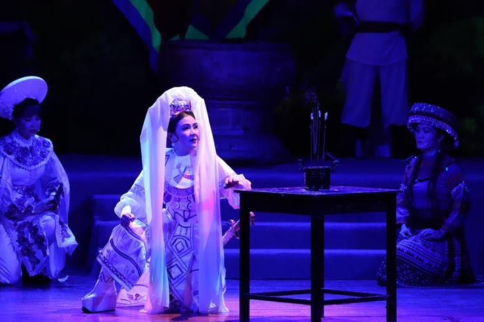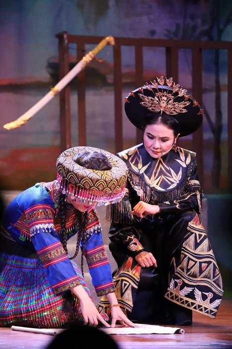Những câu văn chương mượt mà tuyệt đẹp được thể hiện qua từng lời ca đưa khán giả đi qua nhiều cung bậc cảm xúc: “Đói rét chịu được nhưng nhục mất nước không thể nào chịu được, đó là đạo lý của dân tộc ta đời đời truyền lại. Sức ta yếu nhưng lòng dân ta đang phẫn hận, lấy giáo thù giết giặc, ta sẽ lớn mạnh giữa phong ba, lo gì không đủ gươm giáo. Nén giận nhỏ để làm nên việc lớn, vững tay chèo qua vực thẩm sông sâu, lui một bước đuổi giặc thù vạn dặm, dựng cơ đồ nước Việt dài lâu. Kẻ thù lớn hơn ta gấp bội, nhưng: nước Nam ta lưng dựa núi cao, mắt nhìn biển rộng, sẽ lớn nhanh như sức thần Phù Đổng. Như Tản Viên sừng sững trước phong ba, gươm giáo quân thù sẽ nát vụn dưới chân ta. Có lúc nào bằng lúc này! Ruột gan thiếp bừng bừng lửa đốt.