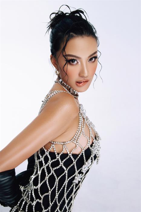 Thoát khỏi hình ảnh lộng lẫy, kiêu sa với những bộ cánh dạ hội lấp lánh, Kim Duyên chọn trang phục cá tính và thời trang để làm mới bản thân. Trong bộ trang phục đầu tiên, Á hậu Siêu Quốc gia lựa chọn diện chiếc váy đen ôm sát cơ thể có điểm nhấn là phần lưới đính đá độc đáo. Cô và ekip chọn găng tay da và vòng cổ đơn giản làm phụ kiện đi kèm. Những tạo dáng của Kim Duyên trong bộ trang phục này đầy tạo báo và cá tính.