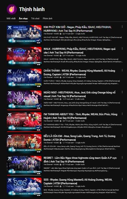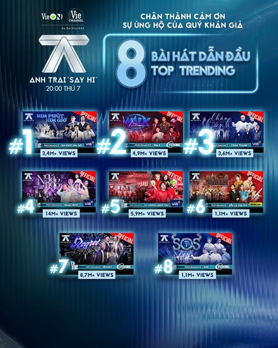 Tintuc - Anh Trai “Say Hi” vững phong độ dẫn đầu xu thế, “say hi” với cơn địa chấn kỷ lục: 8 bài hát thống lĩnh Tab Thịnh hành âm nhạc Việt Nam trải dài từ Top 1 đến Top 8, 2 tuần liên tiếp chiếm lĩnh 1/3 BXH YouTube Music Trending, 11 tuần liên tiếp dẫn đầu Top YouTube Trending từ Top 1 đến Top 3. Anh Trai “Say Hi” đã tạo nên một kỳ tích chưa từng có đối với một chương trình gameshow âm nhạc có độ phủ sóng cao, được mọi