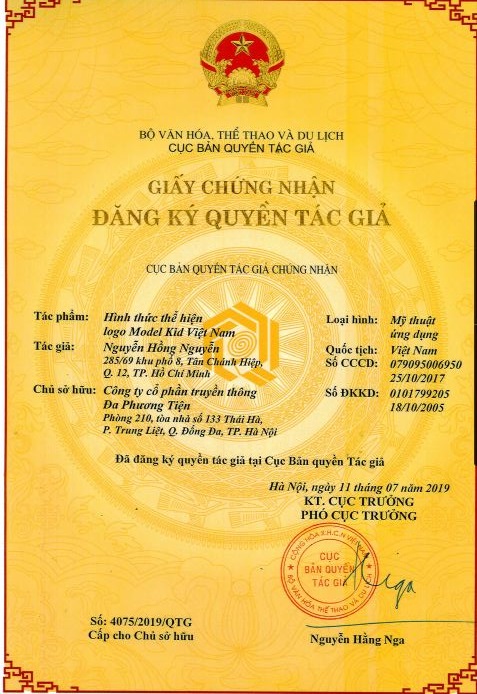Công ty cổ phần truyền thông Đa phương tiện là đơn vị duy nhất đã được xác nhận là Chủ sở hữu hợp pháp của Bản quyền thương hiệu chương trình Model Kid Vietnam, theo Giấy chứng nhận đăng ký quyền tác giả số 4075/2019/QTG, do Cục Bản quyền tác giả, thuộc Bộ Văn hóa, Thể thao và Du lịch chứng nhận tại Hà Nội, ngày 11 tháng 7 năm 2019. Hình ảnh và tài liệu đính kèm chứng thực điều vừa được nêu trên. Điều này đồng nghĩa với việc MultiMedia JSC có đầy đủ quyền hạn để sản xuất, phát sóng chương trình Model Kid Vietnam. Và cũng đồng nghĩa với việc không một cá nhân, đơn vị hay tổ chức nào có quyền đặt điều về vấn đề sở hữu Bản quyền thương hiệu chương trình Model Kid Vietnam đối với MultiMedia JSC.