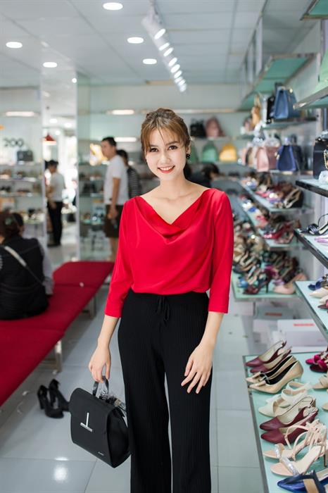 Diện trang phục đỏ nổi bật, Ninh Hoàng Ngân tỉ mỉ lựa chọn, lắng nghe tư vấn từ phía nhân viên để tìm kiếm những đôi giày phù hợp cho mình. Người đẹp bày tỏ niềm thích thú trước mẫu giày chống ế bởi kiểu dáng thời trang, phù hợp với vóc dáng cô và mức giá hợp lý. Sau Hương Giang, Ngọc Hân, Mỹ Linh... Ninh Hoàng Ngân hóm hỉnh cho biết mình sẽ chính thức gia nhập hội “Hoa hậu giản dị nhất Việt Nam”.