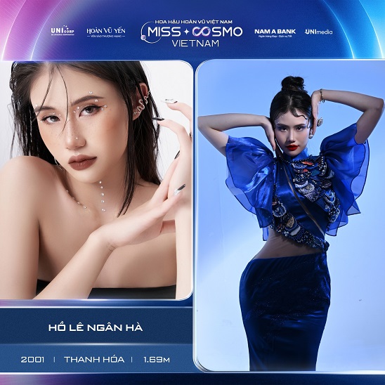 Thí sinh Hồ Lê Ngân Hà ghi dấu ấn bởi gương mặt xinh đẹp tự tin. Nàng sinh viên năm 4 Trường Đại học Mở Hà Nội sở hữu chiều cao 1m69 và thân hình chuẩn. Cô cũng đang hoạt động trong lĩnh vực thiết kế thời trang với những BST thời thượng. Cô chia sẻ khi tham gia cuộc thi Online: “Đến với Hoa hậu Hoàn vũ Việt Nam – Miss Cosmo Việt Nam 2023 là một cơ hội để tôi khẳng định lại chính mình, đem bản thân ra khỏi những giới hạn trước đây. Bên cạnh đó là lan tỏa tình yêu những giá trị truyền thống, mang những thiết kế đậm văn hóa đến gần hơn với tất cả mọi người’.