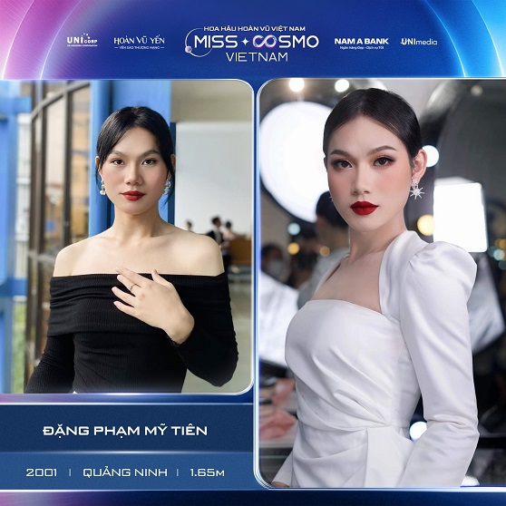 Đặng Phạm Mỹ Tiên năm nay 22 tuổi, sở hữu chiều cao 1m65 đến từ Quảng Ninh. Người đẹp chia sẻ khi đến với Cuộc thi Online: ‘Tôi lớn lên với hình hài là nam, trớ trêu nhận ra rằng đó không phải là con người của mình. Tôi luôn tự hỏi “Mình là ai?” cho đến khi 18 tuổi. Thời điểm ấy, tôi đã công khai thành công với bố mẹ bằng những việc làm chứng minh như học tập và dự án LGBT học đường. Tôi thực sự biết ơn bố mẹ vì đã luôn thấu hiểu và đồng hành”.
