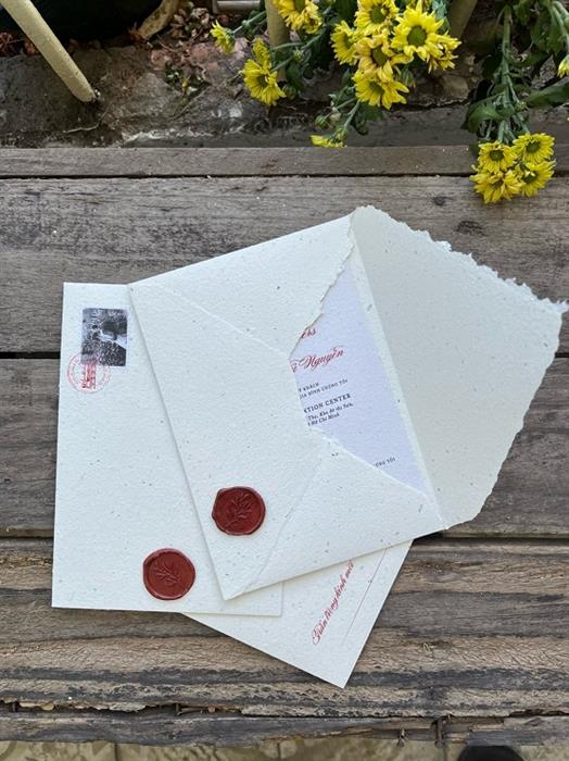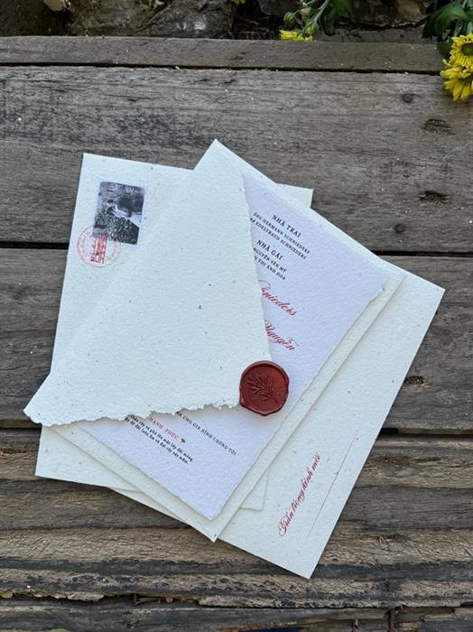 Thiệp cưới của Minh Tú được thiết kế đơn giản, tinh tế. Minh Tú đã khéo léo chọn chất liệu giấy tái chế để chiếc thiệp trở nên đặc biệt. Trên tấm thiệp. có gửi gắm thông điệp “xé nhỏ giấy, để vào chậu và phủ lên một lớp đất mỏng“, hạt giống sẽ nảy mầm khi được chăm sóc, tưới nước hằng ngày. Đó cũng là cách truyền tải thông điệp về một khởi đầu mới đầy sức sống, ươm mầm hạnh phúc hôn nhân. Cô cũng gửi đến các khách mời một video clip hướng dẫn cách ươm mầm hạt giống từ tấm thiệp.