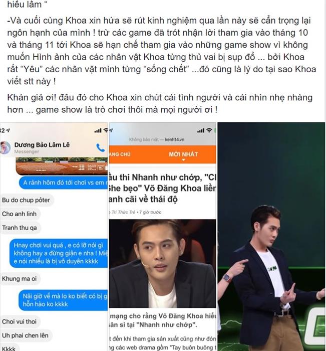 - Và cuối cùng Khoa xin hứa sẽ rút kinh nghiệm qua lần này sẽ cẩn trọng lại ngôn hạnh của mình ! Trừ các game đã trót nhận lời tham gia vào tháng 10 và tháng 11 tới Khoa sẽ hạn chế tham gia vào những game show vì không muốn hình ảnh của các nhân vật Khoa từng thủ vai bị sụp đổ ... bởi Khoa rất “yêu” các nhân vật mình từng “sống chết”... Đó cũng là lý do tại sao Khoa viết status này!