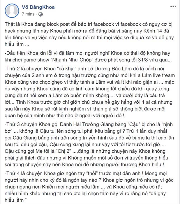 - Đầu tiên Khoa xin lỗi vì đã làm mọi người nghĩ Khoa có thái độ không hay khi chơi game show “Nhanh Như Chớp” được phát sóng tối 31/8 vừa qua.
