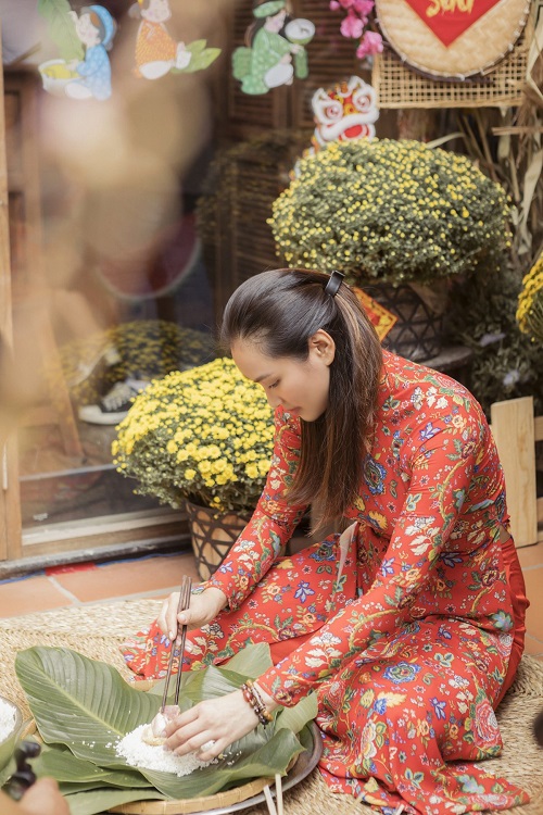 Người đẹp cũng chia sẻ, một trong những hoạt động mà cô và mẹ của mình luôn thực hiện mỗi năm đó chính là gói bánh chưng ngày Tết. Cô thích cái cảnh mọi người cùng quây quần gói bánh, chuẩn bị mâm cỗ. Những điều giản đơn này nhưng đôi khi bị nhịp sống bộn bề mà khiến con người ta bỏ quên.
