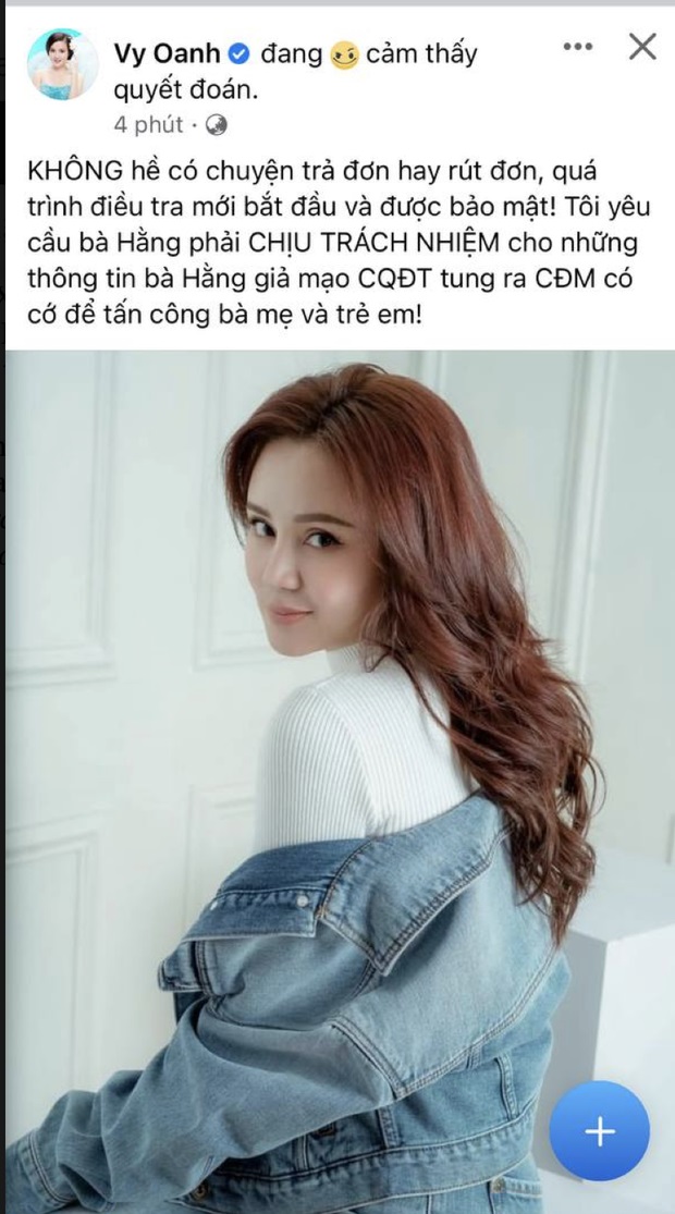 Trước những thông tin trên phía ca sỹ Vy Oanh đã chia sẻ trên trang cá nhân và xác nhận thông tin bà Phương Hằng đưa ra là sai sự thật “Không hề có chuyện trả đơn hay rút đơn, quá trình điều tra mới bắt đầu và được bảo mật! Tôi yêu cầu bà Hằng phải chịu trách nhiệm cho những thông tin bà Hằng giả mạo cơ quan điều tra tung ra để cộng đồng mạng có cớ để tấn công bà mẹ và trẻ em!”.