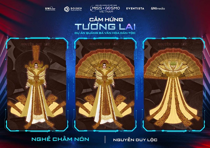 Cũng lấy cảm hứng từ làng nghề truyền thống Việt Nam nhưng NTK Nguyễn Duy Lộc mang đến “làn gió mới” với Nghề Chằm Nón. Chiếc nón lá không chỉ là vật dụng thân thiết, người bạn thủy chung với người lao động dùng để che mưa, che nắng khi ra đồng, đi chợ, là chiếc quạt xua đi những giọt mồ hôi dưới nắng hè gay gắt, mà còn là vật làm duyên, tôn lên vẻ đẹp của người phụ nữ Việt: “Đến với cuộc thi Hoa hậu Hoàn vũ Việt Nam – Miss Cosmo Vietnam 2023 với bộ trang phục Nghề Chằm nón, em mong muốn đem đến hình ảnh người phụ nữ Việt đầy dịu dàng, e ấp nhưng cũng không kém phần mạnh mẽ và kiên cường. Đồng thời qua đó muốn giới thiệu, gìn giữ, lưu giữ, phát huy và quảng bá làng Nghề Chằm nón nổi tiếng một thời đến bạn bè quốc tế”.