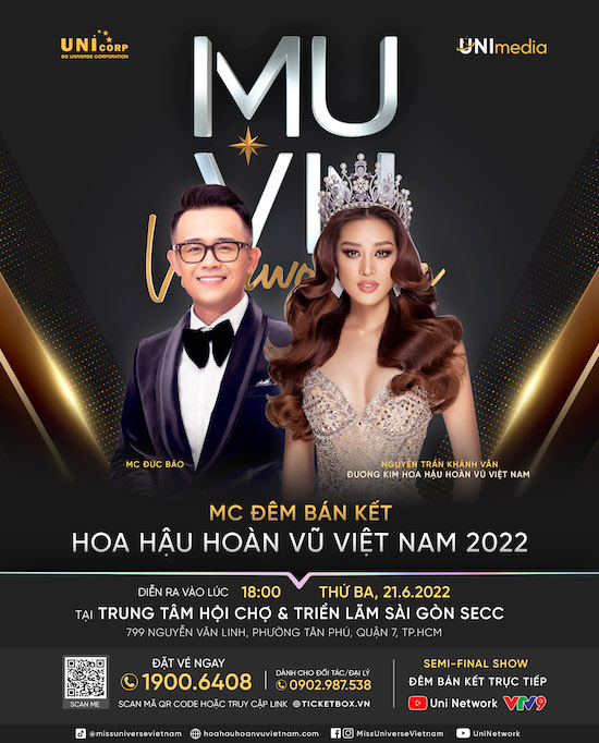 Tintuc - Ban tổ chức (BTC) cuộc thi Hoa hậu Hoàn vũ Việt Nam 2022 vừa chính thức công bố MC và các nghệ sĩ tham gia biểu diễn Đêm Bán Kết, sẽ diễn ra lúc 18:00 Thứ 3, ngày 21/06/2022 tại Trung tâm Hội chợ và Triển lãm Sài Gòn SECC (Quận 7, TP. HCM).