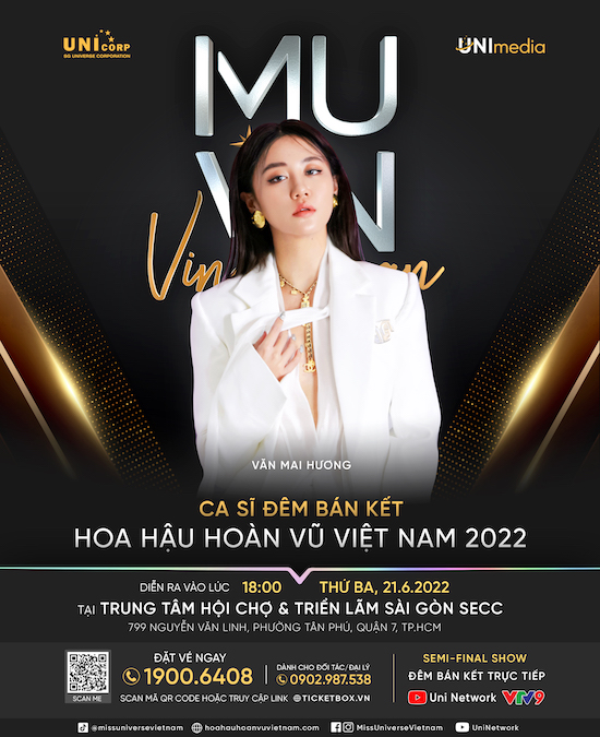 Nhắc đến Văn Mai Hương, khán giả sẽ nhớ ngay đến cô ca sĩ nhạc trẻ với hơn 10 năm trong nghề, là một trong những ca sĩ trẻ tuổi thành công nhất nhì xuất thân từ Vietnam Idol. Cô đạt vị trí Á quân tại cuộc thi Vietnam Idol 2010 khi mới 16 tuổi. Thành công với loạt hit đình đám như: Nếu như anh đến, Ngày chung đôi, Chuyện tình nhà thơ, Ngày gần anh, Nghĩ về anh, Cầu hôn… Gần đây nhất là bản hit “Đốt” và album “Hương” tiếp tục làm mưa làm gió trên các BXH khiến tên tuổi của Văn Mai Hương càng được nhiều người yêu mến. Trình diễn cho Hoa hậu Hoàn vũ Việt Nam 2022, Văn Mai Hương sẽ mang đến các tiết mục được đầu tư hoành tráng và dàn dựng công phu, tiếp thêm động lực cho các thí sinh tự tin thể hiện tốt phần thi của mình. Đây cũng là lần đầu tiên Văn Mai Hương tham gia biểu diễn tại cuộc thi.
