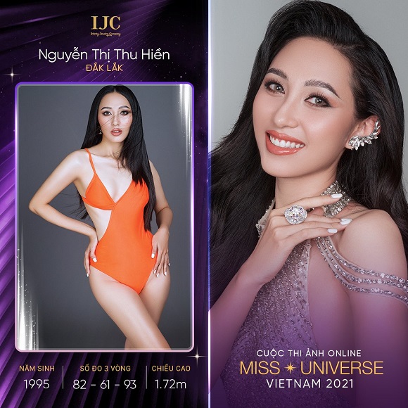 Mặc dù cội nguồn quê hương là ở vùng Nghệ – Tĩnh nhưng thí sinh Nguyễn Thị Thu Hiền (sinh năm 1995) lại được sinh ra tại ĐắK Lắk, sau đó học tập và sinh sống ở TP.HCM. Trải qua nhiều giai đoạn trong cuộc đời, Thu Hiền có những góc nhìn thực tế hơn về cuộc sống người dân, từ những con người miền trung hằng năm phải oằn mình chống lại thiên tai lũ lụt, cho đến những bạn nhỏ khó khăn nơi núi cao, không có cơ hội đến trường và bây giờ là Sài Gòn đang ngày đêm kiên cường chống lại với dịch bệnh. Chính những điều đó đã hình thành một cô gái độc lập, mạnh mẽ, tự tin, dám đương đầu với mọi thử thách nhưng sống rất tình cảm, tin vào những điều tốt đẹp trong cuộc sống. Đến với Hoa hậu Hoàn vũ Việt Nam 2021 với chủ đề VinaWoman, Thu Hiền muốn một lần nữa thử sức mình với những năng lượng tích luỹ thời gian qua, cũng như dùng tri thức, dùng trái tim chinh phục những thử thách trong cuộc thi và chiếc vương miện danh giá. Thu Hiền cao 1m72, số đo hình thể 82-61-93.
