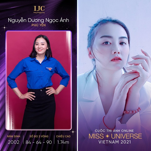 Tự hào là người con của vùng đất Phú Yên, thí sinh Nguyễn Dương Ngọc Ánh (sinh năm 2002) luôn mong muốn có cơ hội quảng bá nét đẹp văn hoá, quê hương mình đến với bạn bè thế giới. Ngọc Ánh hiện đang là sinh viên năm 01, chuẩn bị bước vào năm 02 ngành Luật kinh tế tại đại học Bình Dương. Cô được thầy cô, bạn bè và các anh chị khoá trên yêu mến vì tính cách hoà đồng, thân thiện và biết lắng nghe. Cô quan niệm “Thanh xuân của chúng ta ngắn lắm và cả tuổi trẻ củng như vậy sao chúng ta không một lần thử sức cháy với đam mê khát vọng để tô đẹp thanh xuân và tuổi trẻ để về sau nhìn lại ta không thấy hối tiếc”. Tham gia cuộc thi, Ngọc Ánh muốn chinh phục bản thân, bức phá khỏi những vỏ bọc đã tạo ra và mang hình ảnh chất phát, đằm thắm của người con gái xứ hoa vàng nắng gió, lan tỏa đến tất cả mọi người. Ngọc Ánh cao 1m74, số đo 84-64-90.