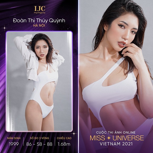 Thí sinh Đoàn Thị Thuý Quỳnh (sinh năm 1999) đến từ Nam Định đã từng tham gia làm người mẫu ảnh, quay các chương trình truyền hình thực tế, từ đó giúp cô tự tin hơn trước đám đông. Vì vậy, tham gia cuộc thi ảnh online Hoa hậu Hoàn vũ Việt Nam 2021 là cơ hội để Thuý Quỳnh một lần nữa rèn luyện bản thân, tìm tòi học hỏi thêm những kinh nghiệm mới. Đang là sinh viên năm cuối khoa Dược, Thuý Quỳnh hy vọng đất nước sớm chiến thắng và vượt qua đại dịch Covid-19, cuộc sống người dân sớm trở về như trước đây. Cô cao 1m68, số đo hình thể 86-58-88.