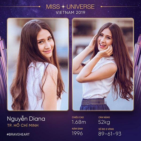 Nguyễn Diana, sinh năm 1996, cao 1m68, đến từ TP.HCM mang trong mình hai dòng máu Việt – Nga. Từng có thời gian hoạt động trong làng giải trí nhưng hiện cô đang làm việc trong lĩnh vực đầu tư tài chính – chứng khoán. Tham gia online Hoa hậu Hoàn vũ Việt Nam 2019, Nguyễn Diana mong muốn đóng góp một phần công sức cho cộng đồng xã hội, thông qua các hoạt động ý nghĩa của cuộc thi.