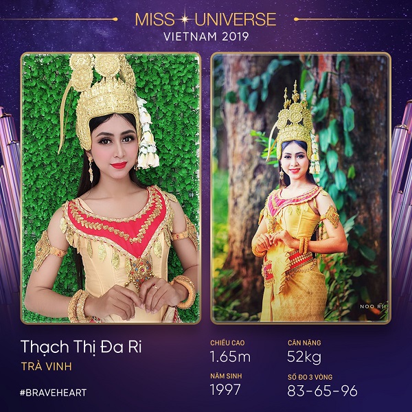 Thạch Thị Đa Ri, sinh năm 1997, cao 1m65 đến từ Trà Vinh là người dân tộc Khmer. Tốt nghiệp trường Đại học Trà Vinh, chuyên ngành Sư phạm Ngữ văn Khmer Nam Bộ, Đa Ri mong muốn thử thách bản thân tại cuộc thi sắc đẹp uy tín, danh giá như Hoa hậu Hoàn vũ Việt Nam 2019. Dù có chiều cao khiêm tốn nhưng cô tin rằng, chỉ cần có niềm tin, có thể làm được mọi chuyện, như câu nói của Hoa hậu H’Hen Niê: “I can do it, You can do it”.