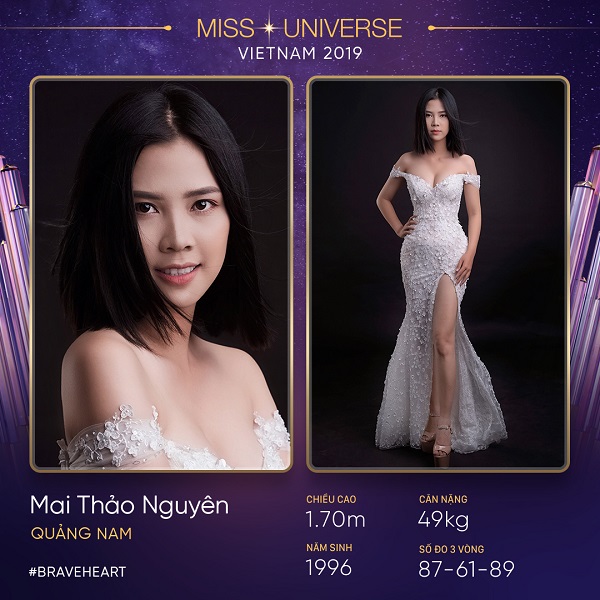 Đại diện đến từ Quảng Nam, Mai Thảo Nguyên, sinh năm 1996, cao 1m70. Sinh ra từ làng quê nghèo xứ Quảng, Thảo Nguyên mong muốn mang nét văn hóa và đặc sắc tâm tình của người con xứ Quảng đến với Hoa hậu Hoàn vũ Việt Nam 2019. Với mái tóc ngắn ấn tượng và tinh thần cầu tiến, nhiệt huyết, Thảo Nguyên không giấu tham vọng sẽ là chủ nhân của vương miện Brave Heart.