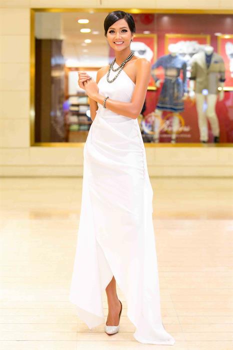 Nếu như Hoa hậu H’Hen Niê tiếp tục chọn sắc trắng trong bộ đầm cổ yếm khoe vai trần quyến rũ thì Á hậu Hoàng Thùy diện bộ đầm cam vai xéo khéo léo khoe đường cong hấp dẫn của mình. Trong khi đó, Á hậu Mâu Thủy chọn bộ váy ngắn màu cam có vạt dài phần tay áo, tạo nét cá tính nhưng không kém phần thanh lịch.