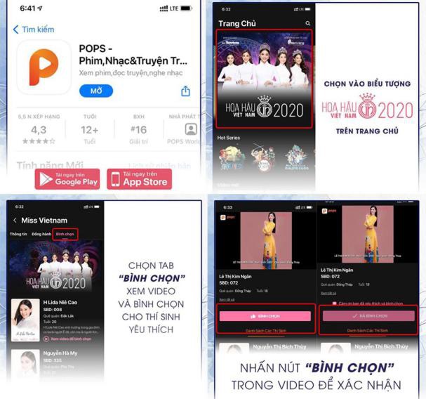 Một lượt ấn vào nút bình chọn trong video của thí sinh sẽ được tính là 1 điểm, mỗi tài khoản không bị giới hạn số thí sinh bình chọn, nhưng chỉ được bình chọn 1 lần cho mỗi thí sinh trong suốt mỗi đợt bình chọn. Ngoài ra, ứng dụng POPS cũng là nơi livestream và phát sóng những chương trình đồng hành và đêm thi chính thức của Hoa Hậu Việt Nam 2020.