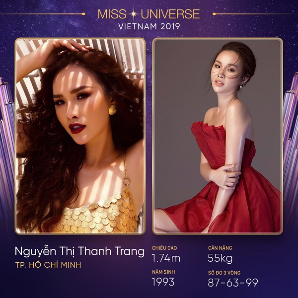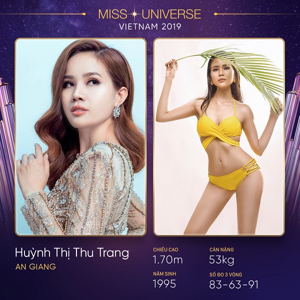 Đến từ tỉnh An Giang là thí sinh Huỳnh Thị Thu Trang, sinh năm 1995, cao 1m70, số đo 83-63-91. Hiện đang là người mẫu nên Thu Trang rất tự tin về kỹ năng trình diễn và chụp ảnh. Cô sở hữu gương mặt hiện đại, có cùng xuất phát điểm là người mẫu như đương kiêm hoa hậu H’Hen Niê nên Thu Trang hi vọng sẽ giúp An Giang tự hào khi là người đầu tiên đem vương miện Hoa hậu Hoàn vũ Việt Nam về cho quê hương.