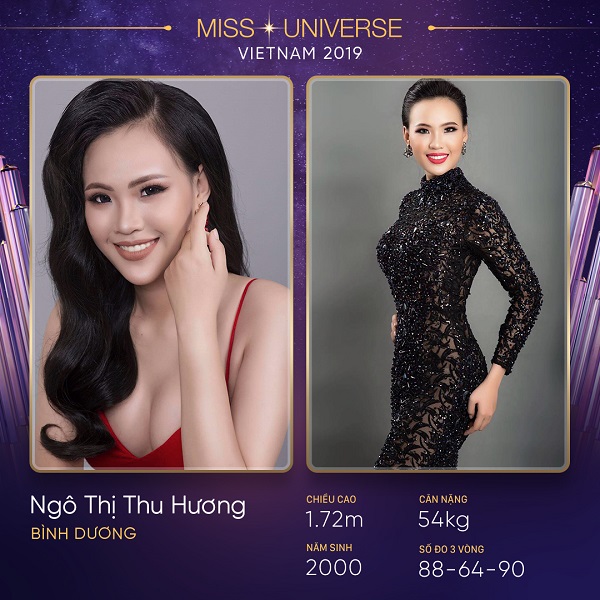 Ngô Thị Thu Hương, sinh năm 2000, đến từ Bình Dương hiện đang là thí sinh nhỏ tuổi nhất cuộc thi. Tuy còn trẻ nhưng cô rất quyết tâm cho cuộc thi Hoa hậu Hoàn vũ Việt Nam, vì hâm mộ nghị lực vươn lên, lối sống giản dị của hoa hậu H’Hen Niê. Chính H’Hen Niê đã truyền cảm hứng và động lực để Thu Hương đăng ký tham gia cuộc thi năm nay. Cô mong muốn được học hỏi và gặp H’Hen Niê để bản thân trưởng thành hơn, có cách sống tích cực hơn. Thu Hương cao 1m72, số đo lần lượt 88-64-90.
