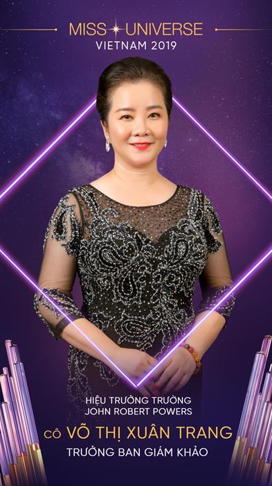 Bà Võ Thị Xuân Trang – Hiệu trưởng trường John Rober Powers tiếp tục giữ vai trò Trưởng ban giám khảo Hoa hậu Hoàn vũ Việt Nam. Không chỉ là người định hướng về nhân cách, tác phong cho thí sinh, bằng kinh nghiệm nhiều năm trong lĩnh vực sắc đẹp, bà Võ Thị Xuân Trang sẽ giúp các thí sinh có tâm lý vững vàng, bản lĩnh để vượt qua các phần thi sắp tới thông qua những bài học, lời khuyên hữu ích được chia sẻ.