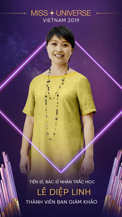 Tiến sĩ, bác sĩ nhân trắc học Lê Diệp Linh là vị giám khảo quen thuộc của Hoa hậu Hoàn vũ Việt Nam trong 3 mùa 2015, 2017 và 2019. Đảm nhận vai trò quan trọng trong phần kiểm tra nhân trắc học, tiến sĩ Lê Diệp Linh chính là người góp phần tìm ra những người đẹp có số đo “vàng” tại các cuộc thi sắc đẹp lớn ở Việt Nam. Giám khảo Lê Diệp Linh là con gái của nhà Nhân trắc học nổi tiếng