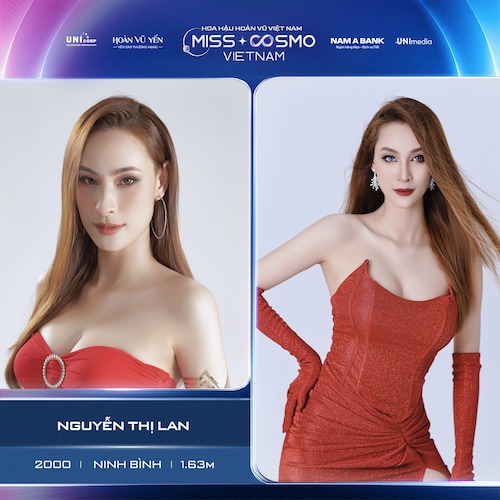 Thí sinh đến từ Ninh Bình – Nguyễn Thị Lan cũng sở hữu thành tích không hề kém cạnh. Cử nhân chuyên ngành Báo chí – Học viện Báo chí và Tuyên truyền; Huy chương Vàng môn Karate – Hội khỏe Phù Đổng tỉnh Ninh Bình 2015; Huy chương Vàng môn Karate – Đại hội Thể dục Thể thao tỉnh Ninh Bình 2018 – 2022 cùng một số thành tích tại cuộc thi sắc đẹp trong nước. Cô cho biết: “Tôi hy vọng rằng, hành trình Hoa hậu Hoàn vũ Việt Nam – Miss Cosmo Vietnam 2023 sẽ giúp tôi có thêm động lực, nguồn sức mạnh to lớn để thực hiện ước mơ của mình, mang đến những giá trị tốt đẹp cho trẻ em.”