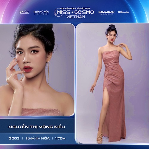 Thí sinh Nguyễn Thị Mộng Kiều đến từ Khánh Hòa sở hữu chiều cao 1m7. Sở hữu ngoại hình có nét lai dân tộc Khmer, mặc dù là người Kinh. Đó là lí do bạn bè đồng trang lứa hay trêu đùa, cợt nhã, nhưng đó lại là động lực để cô tiến bộ, cố gắng từng ngày. “Đến với Cuộc thi Online Hoa hậu Hoàn vũ Việt Nam – Miss Cosmo Vietnam 2023, tôi muốn khẳng định chẳng có thước đo nào dành cho cái đẹp cả, và chẳng có điều gì làm chúng ta lùi bước. Chỉ là bản thân mỗi người có ý thức được về tương lai để cố gắng tiến bộ hơn, và thay đổi hoàn cảnh của mình hay không” – Mộng Kiều chia sẻ.