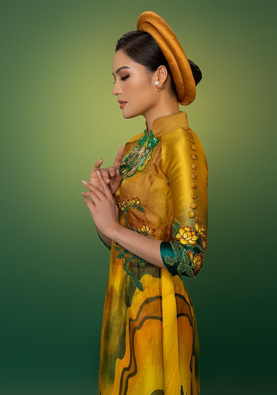 Sở hữu hình thể chuẩn với số đo 3 vòng 81 – 62 – 91, Vân Anh tự tin khoe nhan sắc và vóc dáng trong nhiều kiểu thiết kế áo dài ấn tượng trong bộ sưu tập “Kim Sắc Niên Hoa”. Các mẫu áo dài được làm từ chất liệu tơ tằm, gấm cao cấp, organza tơ tằm được kết hợp tài tình kết hợp thêu đính hiệu ứng 3D hiện đại giúp đại diện Việt Nam tại “Hoa hậu Trái đất 2021” toát lên vẻ quyền lực, quý phái, vừa khoe trọn được nét đẹp đặc biệt của người con gái Việt Nam khi diện trên mình những chiếc áo dài.