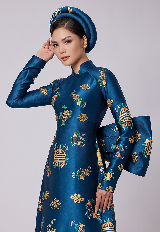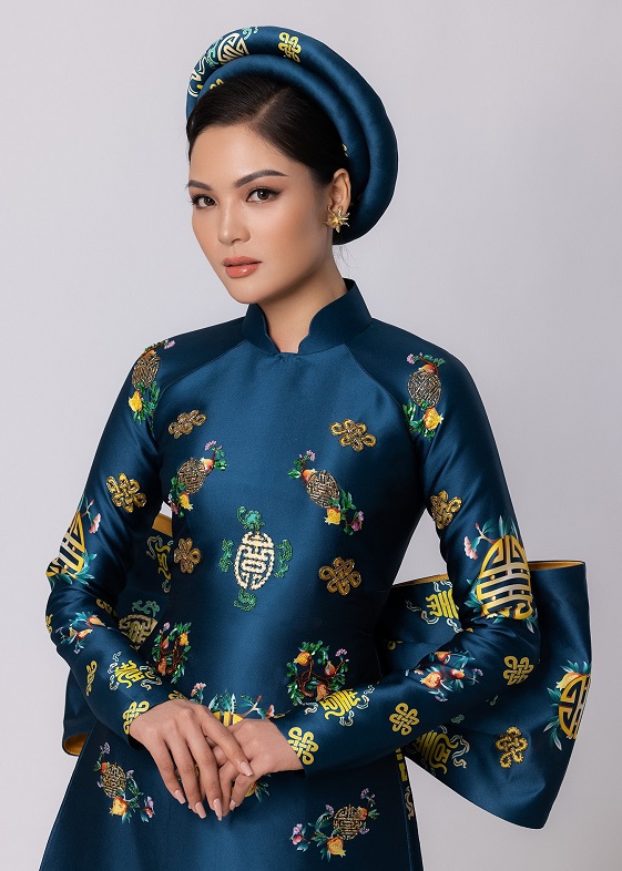 NTK Vũ Lan Anh đã khéo léo kết hợp phom dáng truyền thống với những điểm nhấn, nếp gấp tạo hình nơ to bản, tay bồng, dập ly, thân áo khắc họa nhiều hình ảnh mang đậm nét văn hóa dân gian như trâu vàng, chim hạc, trang Đông Hồ, tranh Kim Hoàng.
