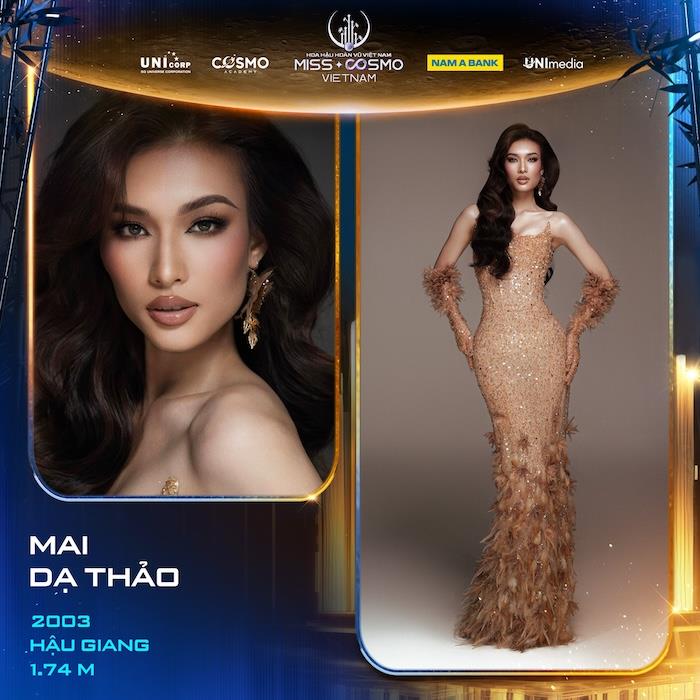 Thí sinh tiếp theo ghi danh cuộc thi online Hoa Hậu Hoàn Vũ Việt Nam – Miss Cosmo Vietnam 2025 là người đẹp Mai Dạ Thảo đến từ Hậu Giang. Với tinh thần không ngừng bứt phá và theo đuổi đam mê, cô gái trẻ này đã ghi dấu ấn của mình với thành tích Top 30 Vietnam’s Next Top Model Online 2024.
