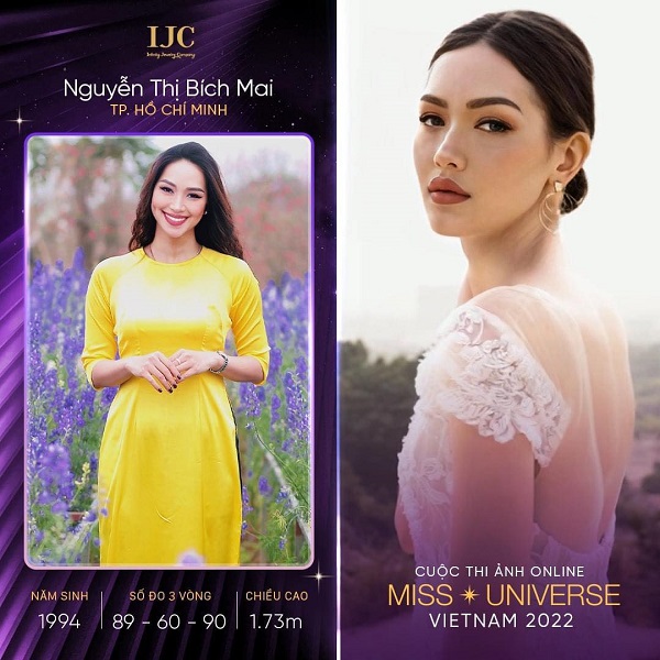 Đại diện đến từ TP.HCM – Nguyễn Thị Bích Mai (sinh năm 1994) hiện đang làm tiếp viên hàng không. Chính những kinh nghiệm trong cuộc sống và nghề nghiệp đã giúp Bích Mai tự tin ghi danh đăng ký tham gia cuộc thi ảnh online Hoa hậu Hoàn vũ Việt Nam 2022. Sở hữu vóc dáng lý tưởng với chiều cao 1m73, số đo 89-60-90 cùng nụ cười tươi rạng rỡ, Bích Mai là một trong những thí sinh có màu sắc thú vị của cuộc thi năm nay.