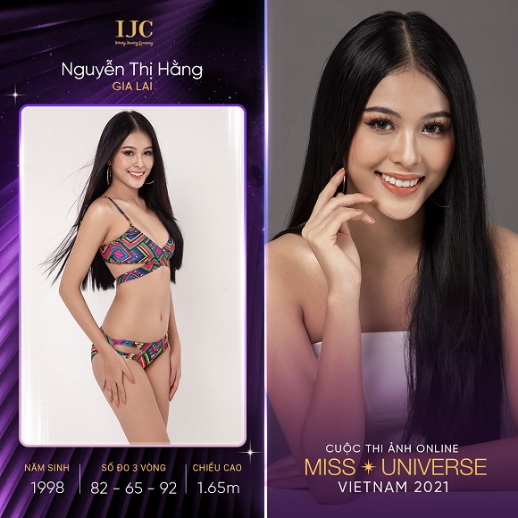 Đến từ Gia Lai là thí sinh Nguyễn Thị Hằng, cao 1m65, số đo 82-65-92. Cô hiện đang sống và làm việc tại TPHCM với công việc kinh doanh tự do. Năng động – Hài hước – Cá tính là ba tính từ dùng để nói về Nguyễn Thị Hằng. Bên cạnh đó, cô còn là người sống thẳng thắn, hoạt náo và thích những nơi đông người để mang lại sự lạc quan, năng lượng tích cực đến với mọi người. Phương châm sống của cô: “Dám nghĩ – dám làm, không ngừng phấn đấu cải thiện bản thân”. Tham gia cuộc thi ảnh online Hoa hậu Hoàn vũ Việt Nam 2021 là bước ngoặc để cô tích luỹ thêm nhiều kinh nghiệm cho cuộc sống và công việc sau này.