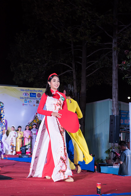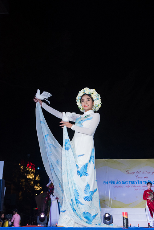 Đỗ Hoàng Anh Thư- học sinh lớp 7A9, Trường THCS Vũng Tàu trình diễn trang phục Áo dài với những cánh chim bồ câu mang thông điệp hòa bình